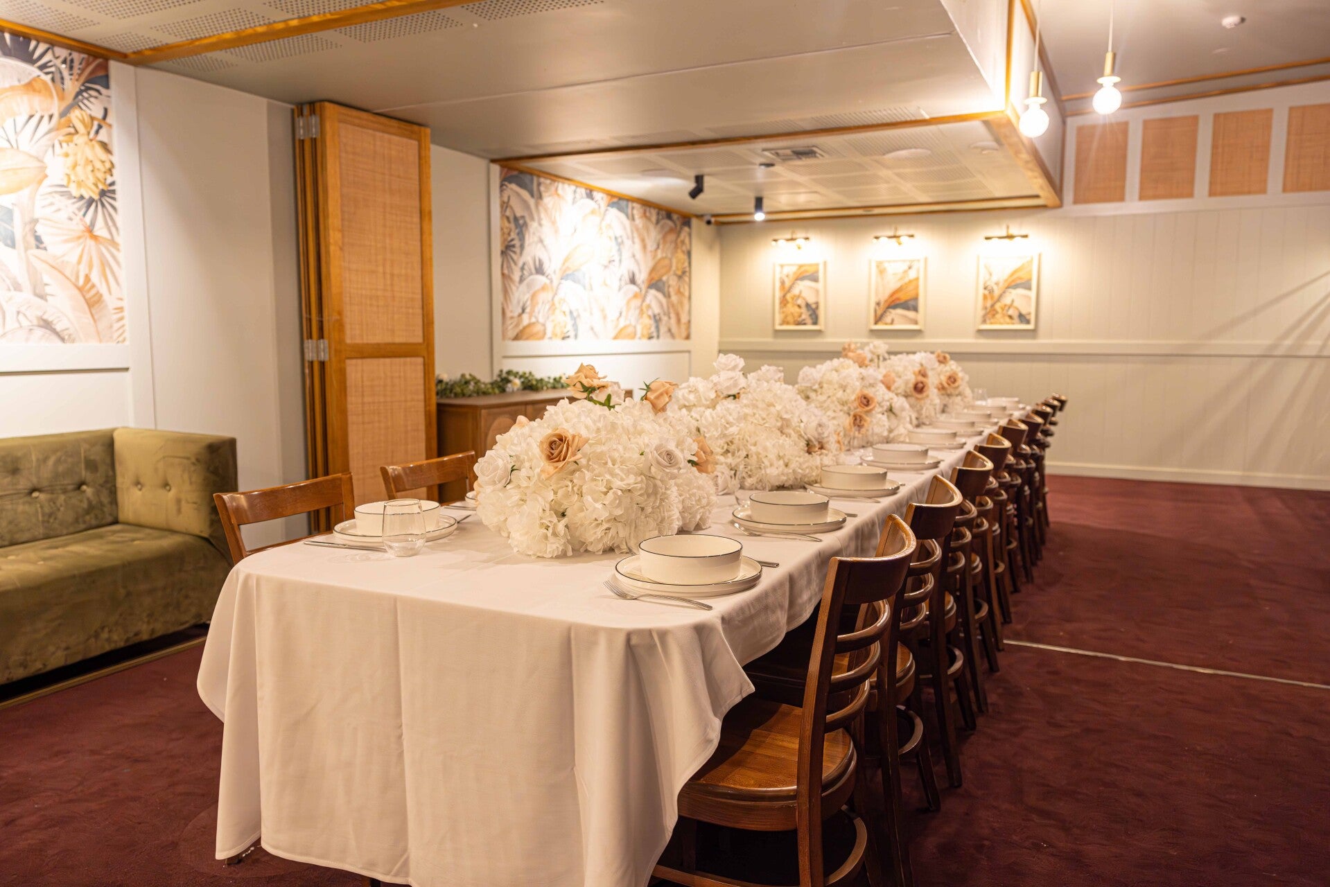 Our newly renovated, exclusive Private Dining Room can fit up to 30 guests within a seated setting, and up to 50 guests cocktail style. For smaller events, the Private Dining Room can be separated into two, exclusive event spaces with the use of our sleek, bamboo wall dividers. This space can be suited for banquet meals, conferences, corporate social events, social gatherings, engagements, weddings, birthdays and much more. With the two main sliding doors that gain entry into the secluded dining space being shut, this allows for an intimate, shared space for you and your guests to enjoy. The Private Dining room can be seen to have a Hamptons, Tropical, Elegant feel to the space with the use of greenery, picturesque designs, and stylish furnishings.
