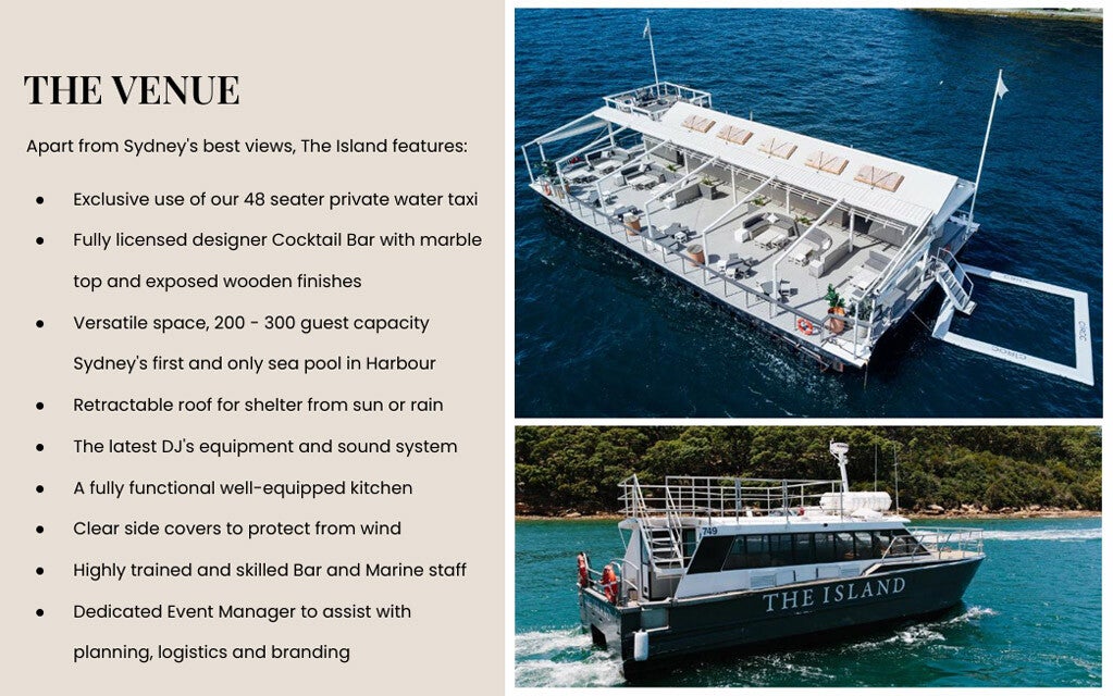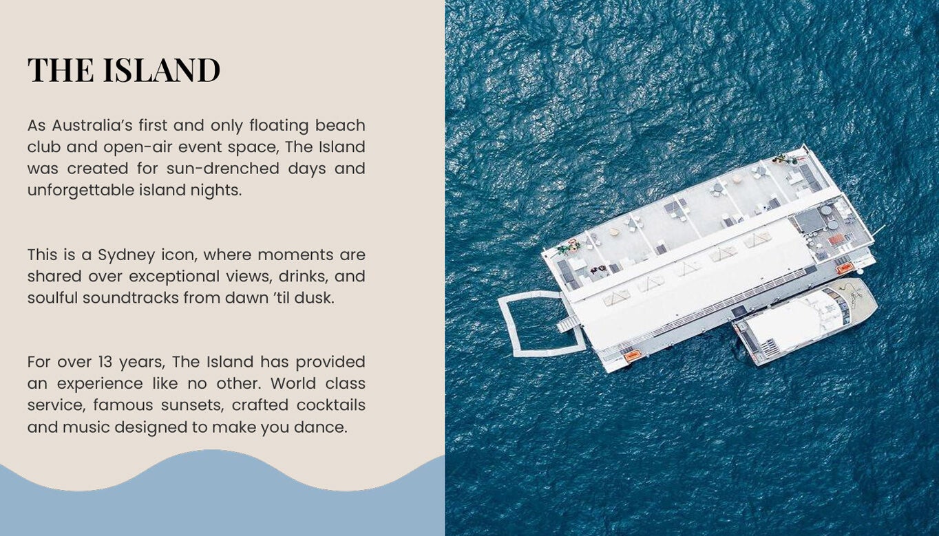 Australia’s first and only floating beach club, The Island was created for sun-drenched days and unforgettable island nights. This is a Sydney icon, where moments are shared over exceptional views, drinks, and soulful soundtracks from dawn ’til dusk. For over 15 years, The Island has provided an experience like no other. World class service, famous sunsets, crafted cocktails and music designed to make you dance. Includes 48 Seater Water Taxi, DJ equipment, dance floor, microphones, private bathrooms, and a mix of dining/booth seating—perfect for parties, presentations, and private events.